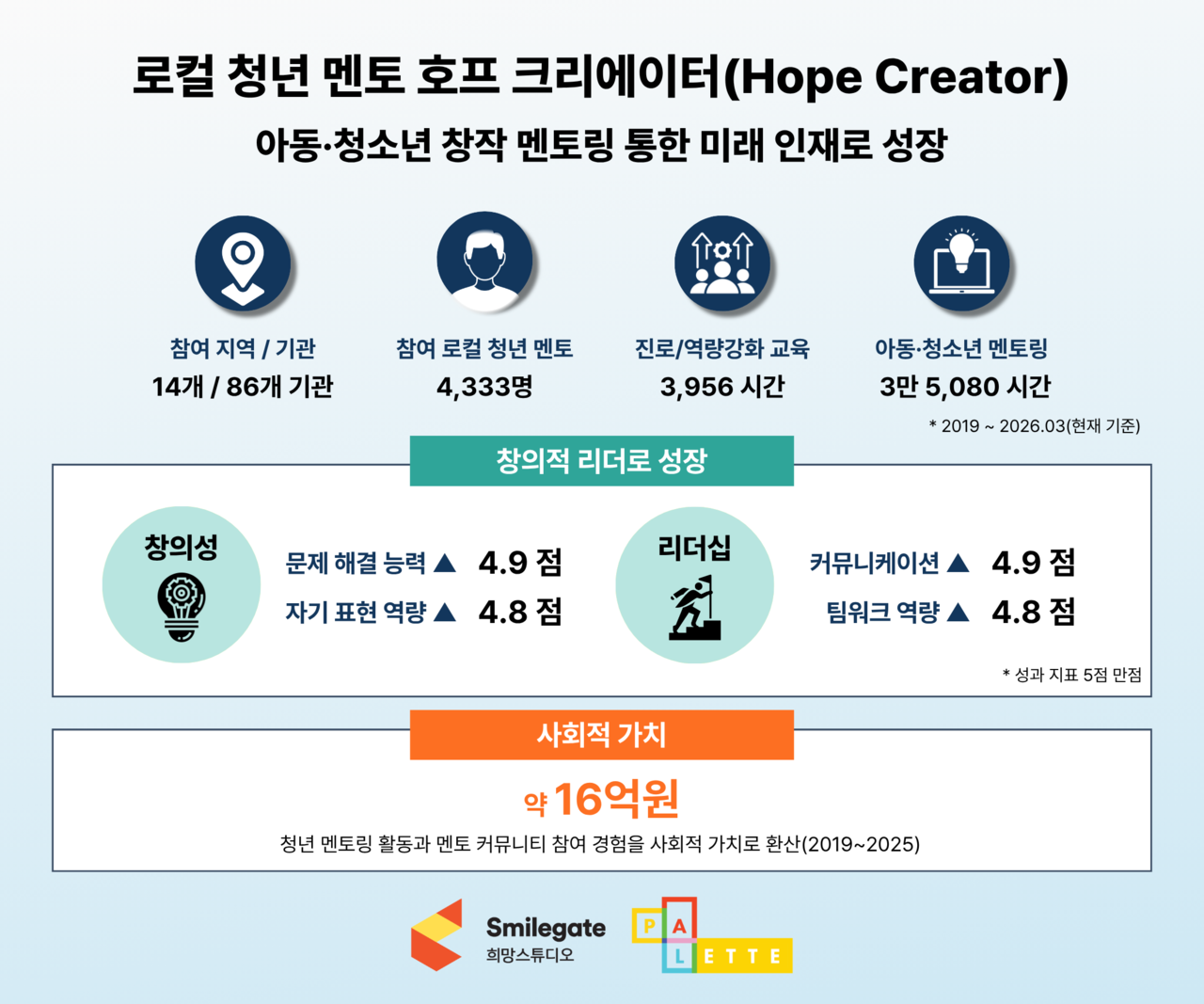 최근 희망스튜디오가 측정한 팔레트 사회적 가치 결과에 따르면, 현재까지 청년 멘토의 아동, 청소년 멘토링과 커뮤니티 활동을 사회적 가치로 환산하면 약 16억 원에 이른다. 이는 팔레트 활동과 동일한 교육 효과를 얻기 위해 사회가 지불해야 하는 대체 비용을 환산한 수치다.